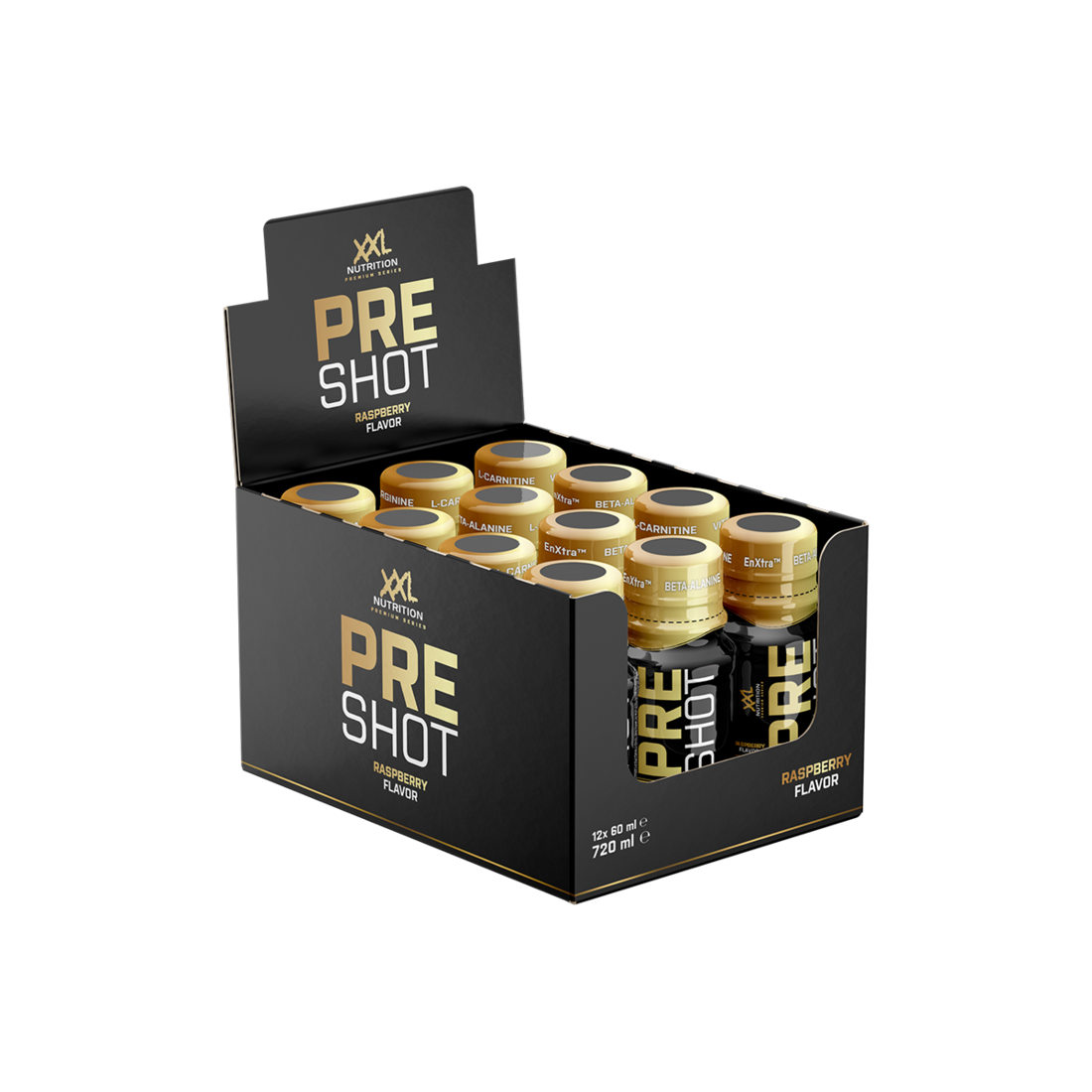XXL Nutrition Pre Shot 12 Pack is een kant-en-klare pre workout shot voor sporters die vóór hun training snel extra energie, focus en trainingsbereidheid willen zonder te rommelen met schepjes en shakers. Elke shot van 60 ml bevat een mix van functionele ingrediënten zoals cafeïne, arginine, beta-alanine, EnXtra™ en L-carnitine. Het product levert vrijwel geen eiwitten, koolhydraten of vetten; de werking komt volledig van de actieve stoffen die invloed hebben op het zenuwstelsel, doorbloeding en het ervaren vermoeidheidsgevoel.